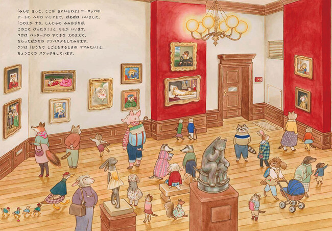 本書は、絵の中に開け閉めできるしかけふた(フラップ)が付いた絵本で、ねこさんかぞくが訪れたミュージアムのお話とともに、散りばめられたフラップをめくって遊ぶ楽しみが詰まった一冊です。
