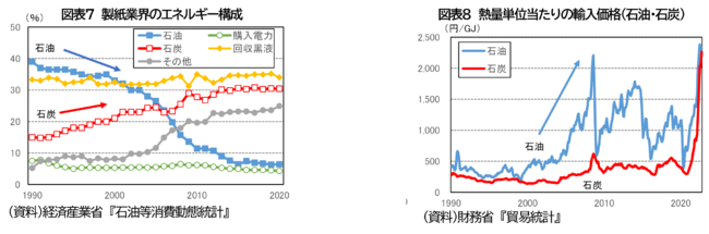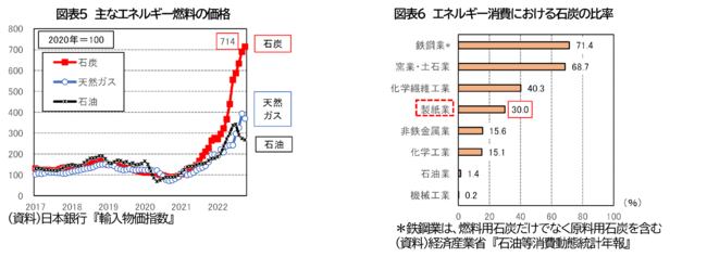 紙の製造工程では、原料の木材チップを高温高圧で蒸解する際や、その後に抽出した紙繊維の水分をドライヤーで乾燥させる際に、大量の熱エネルギーを必要とする。なお、図表4はエネルギー価格高騰前の2019年実績値で算出されている。エネルギーコスト負担が高まっている中で最新のデータではないものの、ここでは業種別の違いを把握するという観点で用いている。また図表5の通り、主なエネルギー燃料の中では、石炭の価格高騰が特に著しい。製紙業のエネルギー消費における石炭の利用比率は30.0%と、エネルギーコストの比率同様、鉄鋼業や窯業・土石業に次ぐ高水準となっている(図表6)。