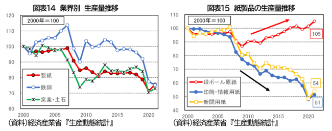 以下では、これまで製紙業界が行ってきた主要製品の構成見直しなど利益確保の取組みについて振り返る。図表14は2000年を基準とした製紙、鉄鋼、窯業・土石の各産業における生産量の推移である。製紙業は2008年のリーマンショック以降に大きく減少した後、回復しないまま、コロナ禍により一段と減少した。但し、製紙業の主要製品別の内訳をみると、印刷・情報用紙や新聞用紙が減少している一方、段ボール原紙は増加している(図表15)。
