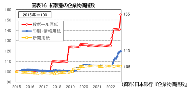 さらに図表16の通り、段ボール原紙の価格は印刷・情報用紙や新聞用紙を上回るペースで上昇している。需要増加を背景に、原料やエネルギーコストが価格に反映されてきたと考えられる。