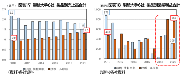 そのような中で製紙大手各社は、印刷・情報用紙から、需要増加の下で価格が上昇している段ボール原紙へ事業構成をシフトさせてきた。図表17と18の通り、セグメント別 売上高・営業利益をみると、過去10年の間に段ボール原紙の営業利益が、印刷・情報用紙の同利益を逆転した。また、段ボール原紙事業の強化だけでなく、パルプ事業などの上流事業や海外事業を積極的に強化している企業もある。