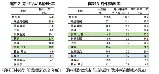 こうした動きは、海外への輸出や海外事業比率が高ければ、足元で進んできた円安のメリットを受けやすいことを意味する。そこで、各製造業種の売上に占める輸出比率を比較すると、製造業全体では20%以上が輸出であるのに対して、製紙業は5%程度に過ぎない(図表12)。これに加えて、総生産額に占める海外事業所売上高の比率を見ても、窯業・土石が半分以上であるのに対して、製紙業は12.1%と11業種の中で下から3番目の低い比率である(図表13)。