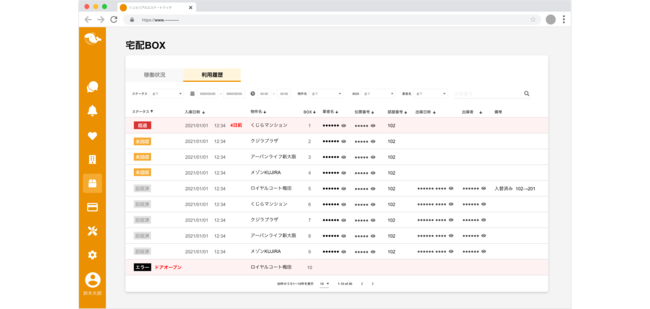 回収済みの利用履歴はもちろん、未回収や受取期限超過になっているボックスと対応する部屋番号が表示されるので、対象の入居者に受け取りを促せます。