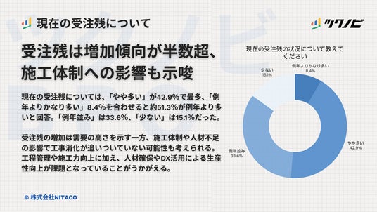 株式会社NITACO(本店:東京都渋谷区、代表取締役:新田 顕大)は、建設業従事者238名を対象に、「建設業の受注数と受注残に関する調査」を実施しました。