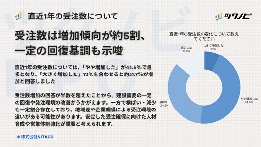 直近1年の受注数については、「やや増加した」が44.5%で最多となり、「大きく増加した」7.1%を合わせると約51.7%が増加と回答しました。「横ばい」は34.5%、「減少した」は13.9%となり、全体としては増加傾向が見られます。