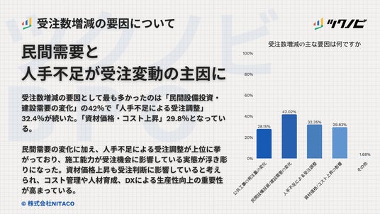 受注数増減の要因として最も多かったのは「民間設備投資・建設需要の変化」で42.0%でした。次いで「人手不足による受注調整」32.4%、「資材価格・コスト上昇」29.8%、「公共工事発注量の変化」28.2%となりました。