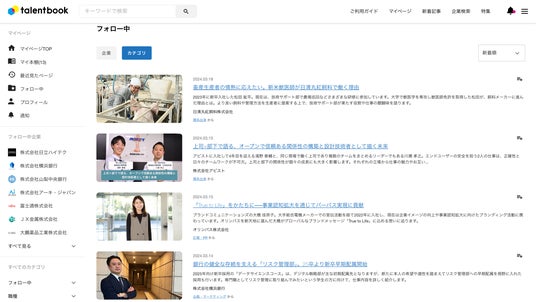 このたび、talentbookの会員に向けてマイページをリリースし、企業・カテゴリの新着を一気に確認できるようになり、自分の興味関心に沿った記事を見つけやすくなりました。