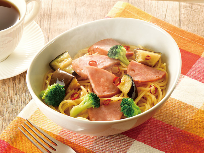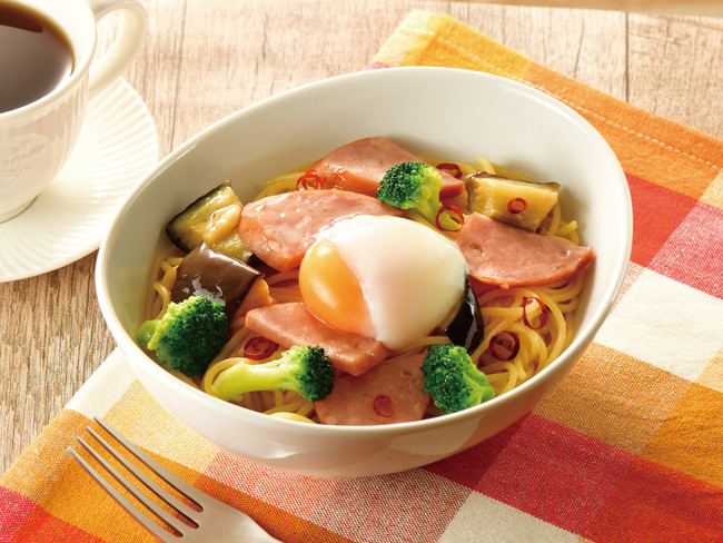 フードメニュー「パスタ ソーセージと揚げなすのペペロンチーノ」は、和風だしを合わせたペペロンチーノソースに、ボロニアソーセージ、揚げなす、ブロッコリーをあわせた具だくさんパスタです。