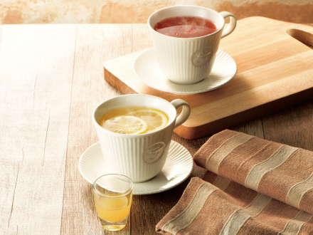 ドリンクメニュー「ぽかぽかゆずレモン~国産生姜シロップ添え~」は、高知県産のゆずとはちみつを使用したゆず茶に、フレッシュなレモンのスライスを加えた、程よい甘酸っぱさがクセになるジューシーな味わいのホットドリンクです。別添の国産生姜を使用したスパイシーな生姜シロップを加えることで、ピリッと引き締まる味わいの変化をお楽しみいただけます。ゆずとレモンの爽やかな香りにほっと心が癒される一品です。
