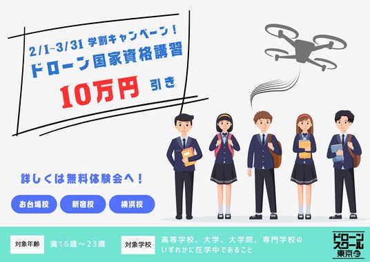 ドローンスクール東京(株式会社ハミングバード:東京都渋谷区、代表取締役:鈴木 伸彦)は、ドローン資格取得を目指す学生を支援すべく、2024年2月1日(木)~2024年3月31日(日)の期間限定でスクール受講費がお得になる学割キャンペーンを行います。