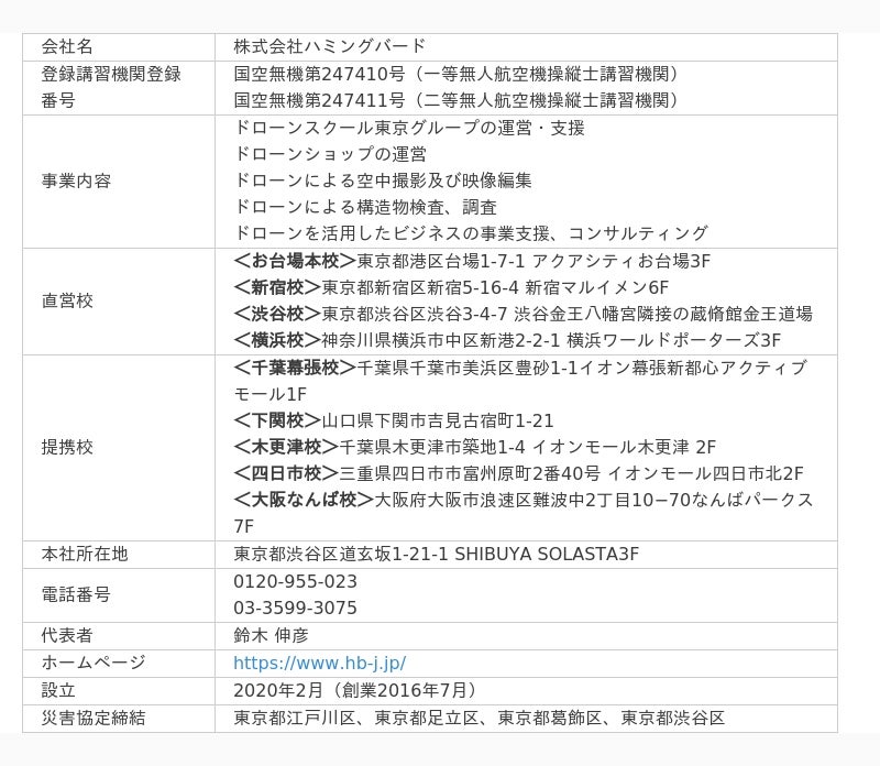 日本初の商業施設内のドローンスクールとして、2018年11月に「ドローンスクールお台場本校」を開校。2021年7月からは新宿マルイメン6階に「ドローンスクール新宿」を開校。2022年11月には神奈川県初となる「ドローンスクール横浜」を開校しました。