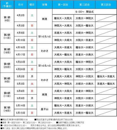 龍谷大、大阪商業大、京都産業大、大阪経済大、神戸学院大、大阪学院大の6チーム総当たり、勝ち点制で順位を決定します。