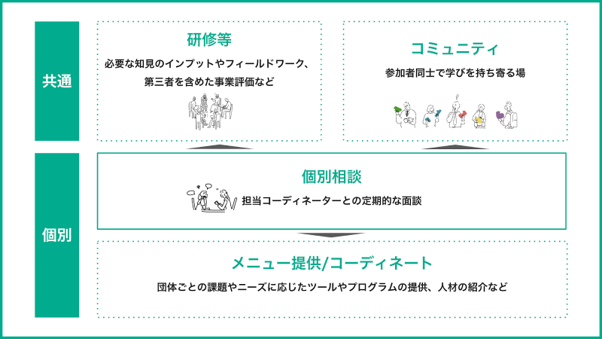 伴走支援の一環としてはこれまで、担当コーディネーターによる定期的な面談(個別面談)を軸に、事業進捗に応じた研修等の実施やコミュニティの運営、団体ごとの課題やニーズに合わせたメニュー提供やコーディネートなどの支援を行ってきました。