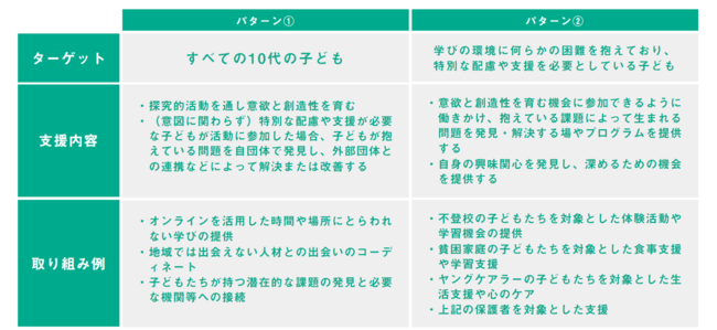 10代(小学校高学年から中高生を想定)に継続的に居場所や対話の機会を提供しながら、以下のパターン1・2いずれかまたはその両方に取り組む事業
