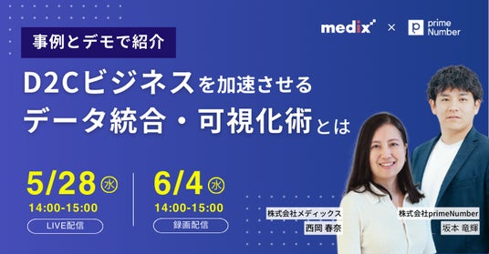 インターネット黎明期から企業のデジタルマーケティングを支援する株式会社メディックス(本社:東京都千代田区、代表取締役:田中正則、以下メディックス)は、D2C事業者様向けに、オンラインセミナー「 【事例とデモで紹介】D2Cビジネスを加速させるデータ統合・可視化術とは」を株式会社primeNumber (本社:東京都品川区、代表取締役:田邊 雄樹、以下primeNumber)と共催で実施いたします。