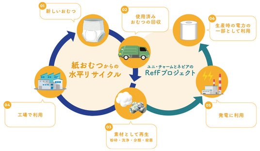 RefF(リーフ)とは「Recycle for the Future」の頭文字をとったもので、ユニ・チャームが展開する水平リサイクルのブランド名です。当社は持続可能な社会の実現に貢献するべく「使用済みの紙パンツを捨てないみらい」に向けてリサイクルに取り組んでいます。以前より使用済み紙パンツ・紙おむつ排出量増加問題への取組検討を進めていた王子ネピアは、この考えに賛同しこの度のプロジェクト参画となりました。