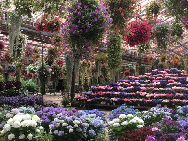 加茂荘オリジナルアジサイを中心に、温室の真ん中にアジサイヒルズを展示しており、ヒルズから直接お好みのアジサイをえらんでご購入していただけます。
