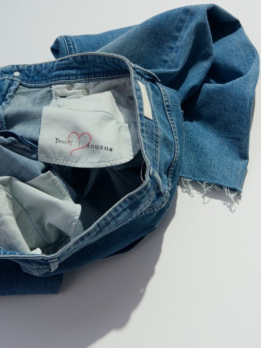 腰帯の「for anuans」オリジナル刺繍をはじめ、スレーキには「YANUK|anuans」オリジナルスタンプを施すなど、特別感のある一着となっている。