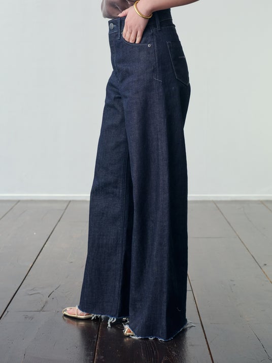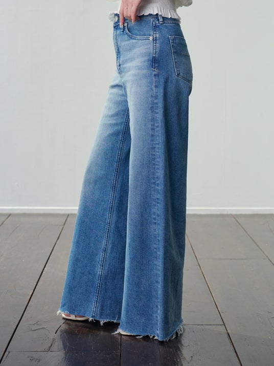 腰まわりはすっきりとフィットさせながら、太もも上から裾にかけてAライン状に広がるワイドフレアシルエット。