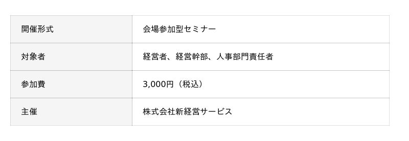 日本の人事制度コンサルティングに強みがある、株式会社新経営サービス 人事戦略研究所(本社:京都府京都市、代表取締役社長:森谷克也)は、会場参加型セミナー「何度も失敗した中小企業のための 人事評価制度「1から出直し」セミナー」を2026年5月20日(水)大阪のAP大阪駅前(大阪市北区)、2026年5月28日(木)東京のAP東京丸の内(東京都千代田区)、にて開催いたします。