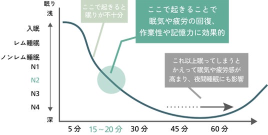 NAP(仮眠)では、深い眠り(ノンレム睡眠のうち、第3段階目)に入りきる前に目を覚ますことが重要と言われています。第2段階に到達するには、寝付くまでの時間を含めて約15~20分ほどかかります。つまり、熟睡し過ぎず、ちょうどよい時間(約15分)で目覚められる工夫が必要。
