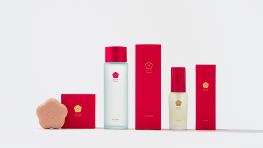 左より、椿酵母せっけん60g (¥1800)、椿の葉 保湿水(¥3800)、椿酵母オイルW 40mL(¥4950)