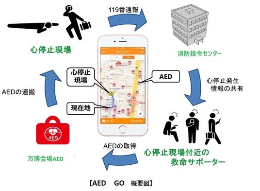 日本で開催される今回の博覧会において、私どもAEDチームはAED本体(屋外設置・携行型モバイルAED)やAED運搬支援システムを会場来場者やスタッフの救命が行えるよう配置し、スタッフへの講習及び緊急時の各システムを協賛いたします。