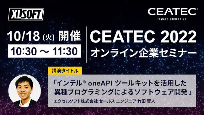 エクセルソフトは、2022年10月18日 (火) から 2022年10月21日 (金) までの 4 日間、幕張メッセ (千葉県千葉市) で開催される「CEATEC 2022」の幕張メッセ会場のブースに加え、2022年10月1日 (土) から 2022年10月31日 (月) までの 1 か月間にわたって公開されるオンラインブースにて、インテル(R) oneAPI ツールキットを出展します。