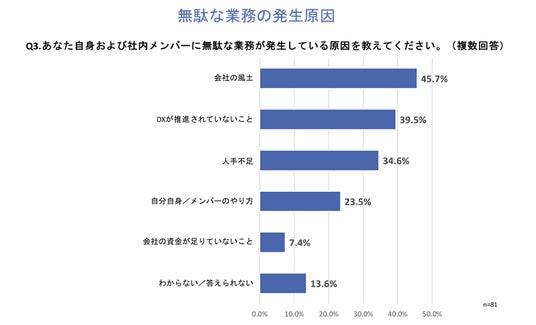 Q1で「特にない」かつQ2で「特にない」以外を回答した方に、「Q3.あなた自身および社内メンバーに無駄な業務が発生している原因を教えてください。」と質問したところ、「会社の風土」が45.7%、「DXが推進されていなこと」が39.5%、「人手不足」が34.6%という回答となりました。