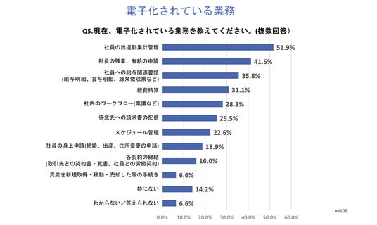 「Q5.現在、電子化されている業務を教えてください。」と質問したところ、「社員の出退勤集計管理」が51.9%、「社員の残業、有給の申請」が41.5%、「社員への給与関連書類(給与明細、賞与明細、源泉徴収票など)」が35.8%という回答となりました。