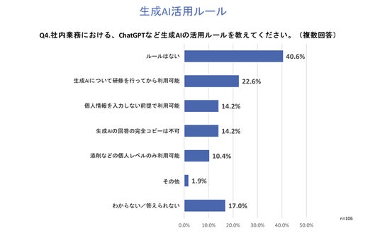 「Q4.社内業務における、ChatGPTなど生成AIの活用ルールを教えてください。」と質問したところ、「ルールはない」が40.6%で最多回答となりました。続いて、「生成AIについて研修を行ってから利用可能」が22.6%、「個人情報を入力しない前提で利用可能」が14.2%、「生成AIの回答の完全コピーは不可」が14.2%という回答となりました。