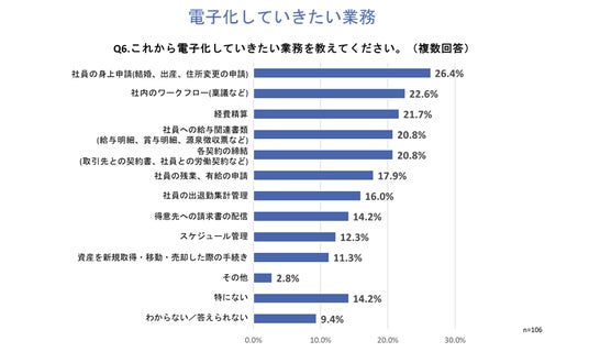 「Q6.これから電子化していきたい業務を教えてください。」と質問したところ、「社員の身上申請(結婚、出産、住所変更の申請)」が26.4%、「社内のワークフロー(稟議など)」が22.6%、「経費精算」が21.7%という回答となりました。