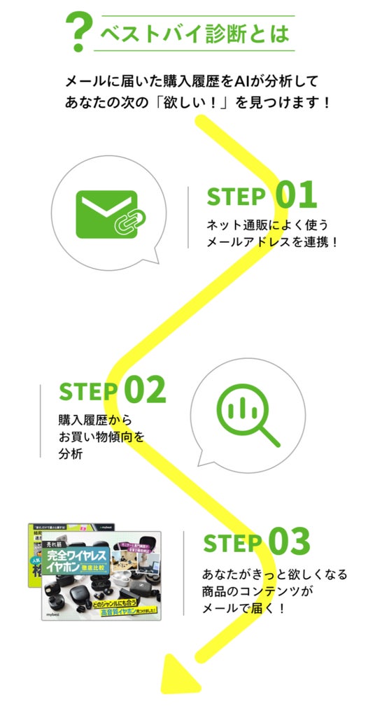 新機能として追加した「ベストバイ診断」は、普段ECサイトでのお買い物時に利用しているメールアドレスと連携し、購入履歴を診断することで、そのユーザーが”次に欲しくなる商品・サービス”のコンテンツをユーザーにお知らせいたします。
