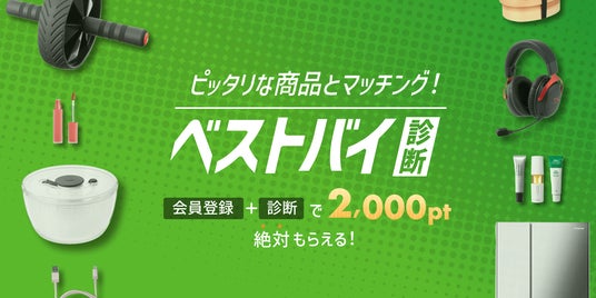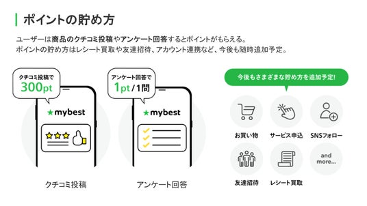 初回会員登録で1,000ポイント(10ポイント=1円相当)を付与します。また貯まったポイントは5,000ポイントより出金が可能となり、新たなお買い物に役立てることができます。今後、マイベストのオリジナル特典やサービスの提供も予定しています。