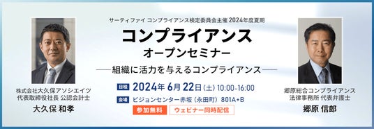 株式会社サーティファイ(本社:東京都中央区、代表取締役:瀧澤茂)コンプライアンス検定委員会は、郷原総合コンプライアンス法律事務所 代表弁護士 郷原信郎氏と、株式会社大久保アソシエイツ 代表取締役社長 大久保和孝氏を講師に招き、「2024年度夏期コンプライアンスオープンセミナー -組織に活力を与えるコンプライアンス-」を2024年6月22日(土)にビジョンセンター赤坂(永田町) 801A+B号室とオンライン配信のハイブリッドで開催します。