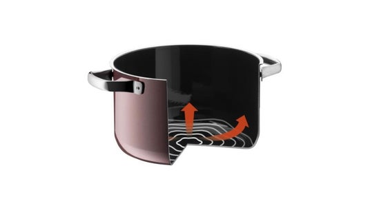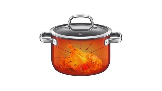 約30種類の天然鉱石を使用したWMF独自のミネラル素材「フュージョンテック」は、遠赤外線効果による加熱効果が高く、均一に、短時間で火が通るので素材の色や香り、風味はそのままに、料理を美味しく仕上げます。無水調理が可能で、水を加えずに食材が持つ水分で調理ができるため、食材本来の凝縮された旨みを味わうことができます。光沢のあるガラスのように滑らかな表面は、こびりつきにくく、使った後の汚れもスルッと落ちてお手入れも簡単。ガスやIHクッキングヒーターなど全ての熱源に対応し、食器洗浄機もお使いいただけるなど、使いやすさと丈夫さも兼ね備えており、長くお使いいただけます。