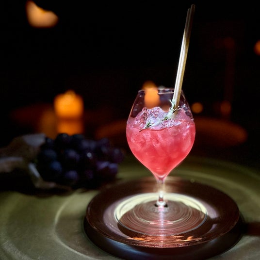 ワインの原材料である巨峰は、白ワインベースのカクテルで。合わせるのは、クランベリージュースとレモンジュース。酸味と甘味のバランスが絶妙なすっきりとした味わいです。
