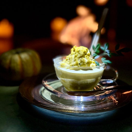 この時期のかぼちゃは甘味が強いため、黒糖でつけこんだラムとカカオのリキュールをアクセントに。