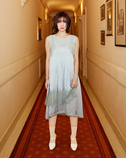 MOMO氏が着用するドレスは、ランジェリーウエアやニットなどの日常的なアイテムを引き算の美学によって再解釈し、ディテールの繊細さを引き出しています。シンセティックファーがあしらわれたクロッグやパンプス、サマーサンダルなどのフットウエアと合わせ、ドレッシーでありながらも、リラックスできるコンフォートさを表現したユニークなスタイリングとなっています。フォーマルから日常的なシーンまでさまざまな場面での着用が可能です。