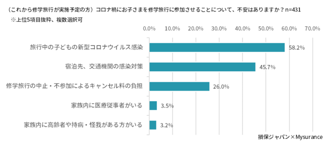 ■これから参加させる際に不安なことTOP3は「旅行中の子どもの新型コロナウイルス感染(58.2%)」、「宿泊先、交通機関の感染対策(45.7%)」、「修学旅行の中止・不参加によるキャンセル料の負担(26.0%)」