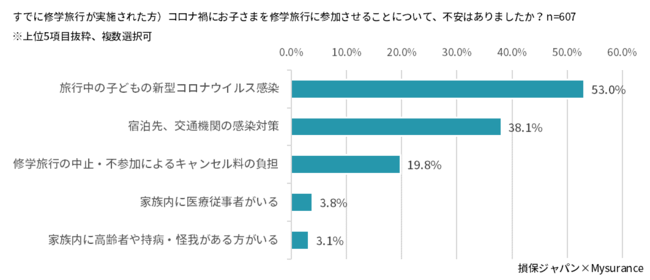 ■参加させた際の不安TOP3は「旅行中の子どもの新型コロナウイルス感染(53.0%)」、「宿泊先、交通機関の感染対策(38.1%)」、「修学旅行の中止・不参加によるキャンセル料の負担(19.8%)」