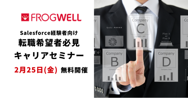データ・プロセスのコンサルティング及びアウトソーシングサービスを提供しているフロッグウェル株式会社(所在地 : 東京都港区、 代表 : 大田宏之、以下「フロッグウェル」)は、『Salesforce経験を生かした転職する前に、絶対に知っておきたい10個のキャリアプラン』をテーマとしたオンラインセミナーを、転職を希望するSalesforce経験者に向けて2月25日(金)に無料で開催いたします。