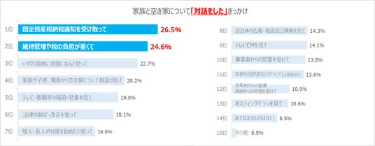 家族の対話をするきっかけの1位は「固定資産税通知を受け取って(26.5%)」2位は「維持管理や税の負担が重くて(24.6%)」。空き家対策が進む要因である「家族の対話」を後押しするのは「税と管理の負担」であると言えます。