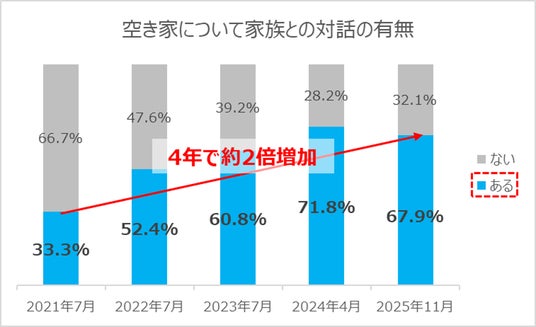 空き家の相続について、家族と対話をしている人は67.9%で、4年で約2倍増加し、空き家所有者の空き家の相続に対する意識が高まっていると考えられます。