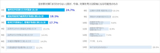 そして、空き家対策は「まだわからない」と回答した層が、対策を考えるきっかけの1位は「老朽化や災害リスクが高まったとき(24.7%)」。2位は「固定資産税や維持費が負担に感じたとき(18.1%)」、3位は「管理が負担に感じたとき(17.7%)」でした。