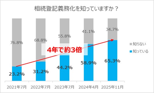 空き家所有者のうち、相続登記義務化を知っていると答えた人は65.3%。調査開始から4年で約3倍に増え認知が広がっている傾向にあります。