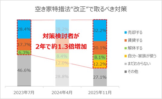 2023年12月に改正された空き家特措法により、取るべき対策として最も多いのは「売却(32.2%)」で3人に1人の割合で選択しています。次いで多いのは「まだわからない(28.8%)」という対策未検討層ですが、2年で空き家対策の検討層が1.3倍増加しています。