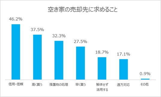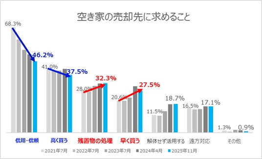 空き家対策で最も検討されている「売却」について、売却先に求めることの1位は「信用・信頼できる(46.2%)」、次いで「高く買ってくれる(37.5%)」と例年に引き続き一般的な要素が上位2項目を占めています。一方で3位の「残置物を処理してくれる(32.3%)」と、4位の「早く買う(27.5%)」という“手離れの良さ”を特徴としてもつ項目は、年々増加傾向にあります。
