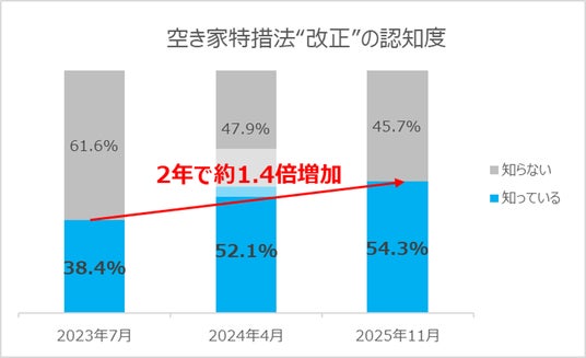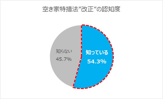 空き家所有者のうち、今年空き家特措法が改正されたこと知っていると答えた人も変わらず約5割。