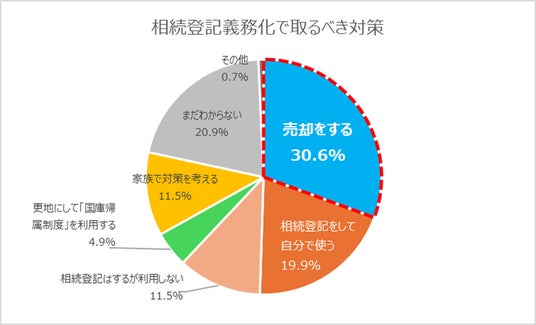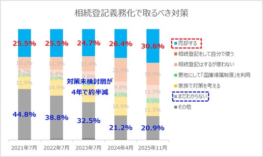 相続登記義務化により取るべき対策の1位は「売却する(30.6%)」が最多。売却意向は4人に1人以上の割合で、調査開始から常時存在しています。さらに、対策を考えていない層は調査開始から半減し、過去最少の数値となりました。